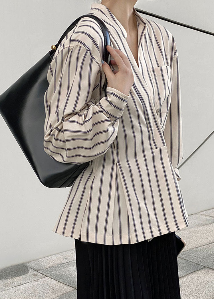 Art Striped Stand Collar Flattering Shirt Long Sleeve Fabric: Cotton Blended Size & Fit: Fit: This garment fits true to size. Length: Size S measures 27.3"from shoulder to hem Bust: Great for any cup size. Waist: Loose Fit. Comfortable room throughout midsection. Hip: Loose Fit - room for hips. Hand Wash Cold.