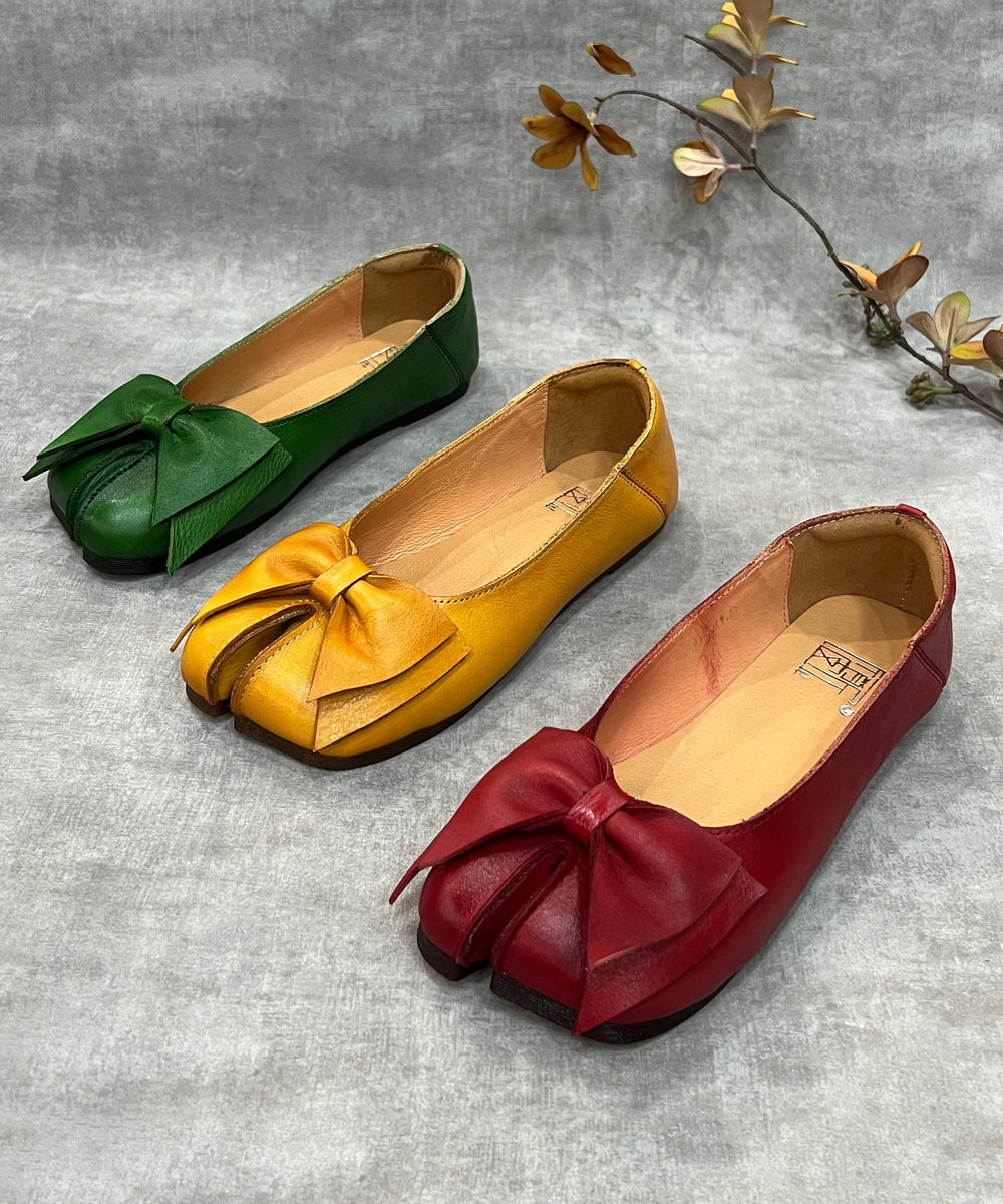 Women Green Bow Split Toe Cowhide Leather Flat Shoes For